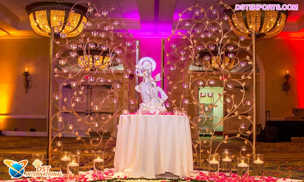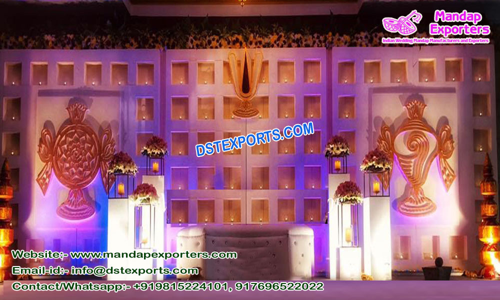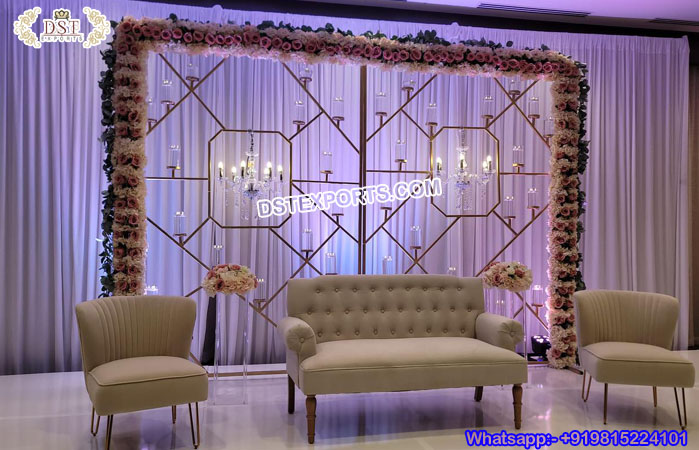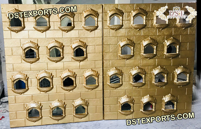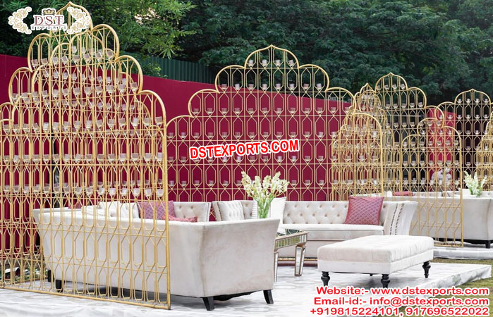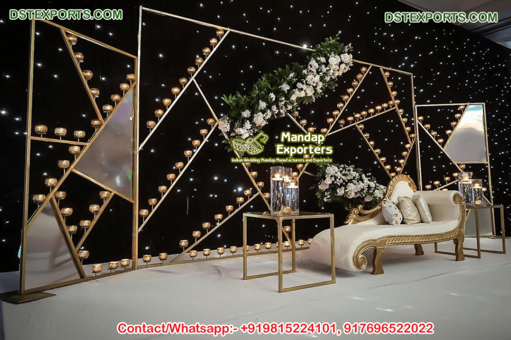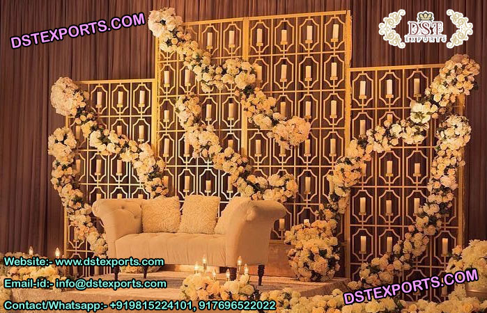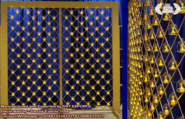 We have many design in candle walls like – Basic and simple design metal candle wall, Box style wooden Candle walls, Jhronka style fiber candle wall. These candle walls are provided in any size and shape like – Rectangular, Round, Half-moon, Hexagon style. These Back-walls are beautifully designed in a criss-cross manner as well as there is a small bowl in which candles can be fitted. This candle backdrop can be decorated with flowers or candles.